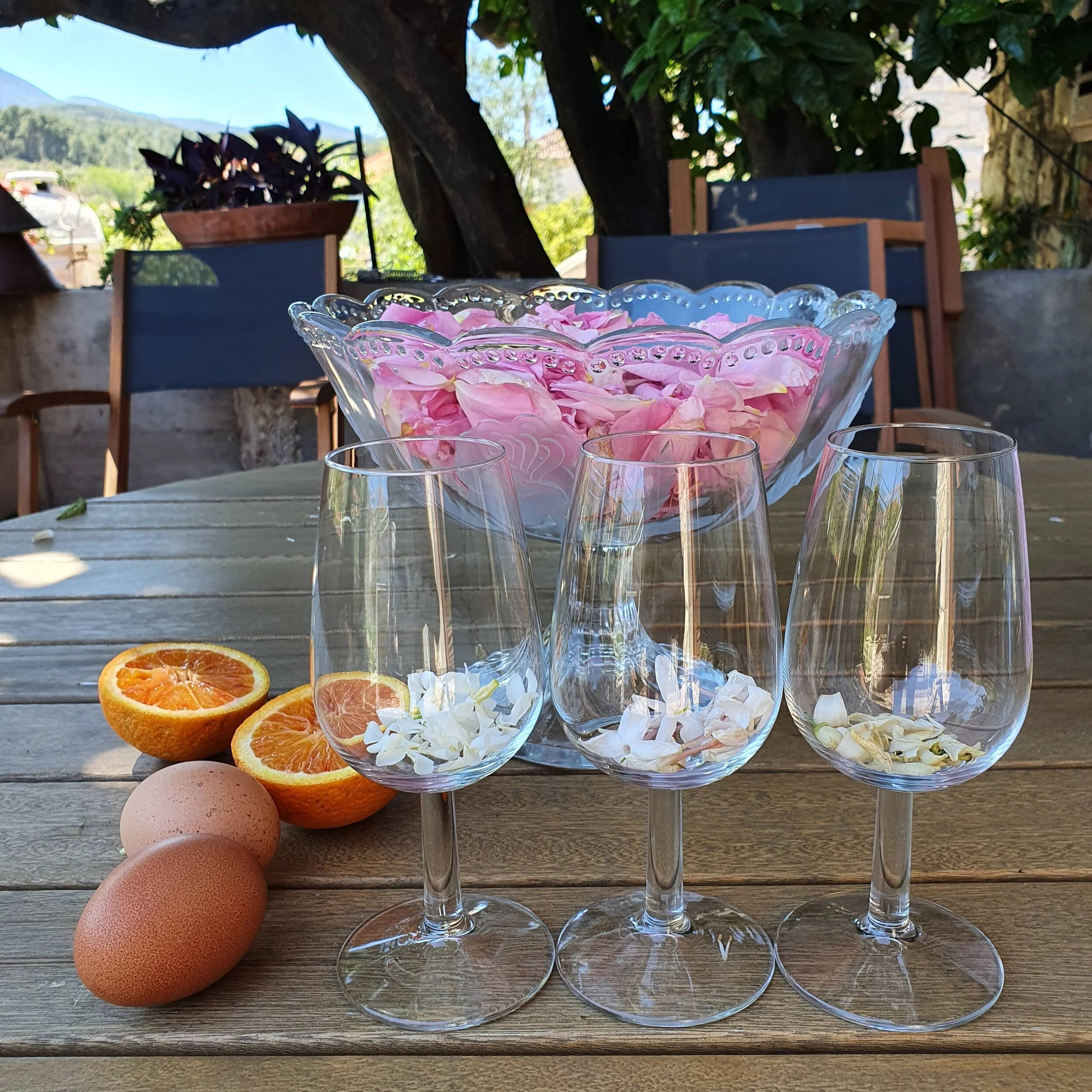 In the backyard of the Duboković winery in Jelsa on the island of Hvar. Three types of jasmine in the glasses rose petals and wild orange from the tree above the terrace.