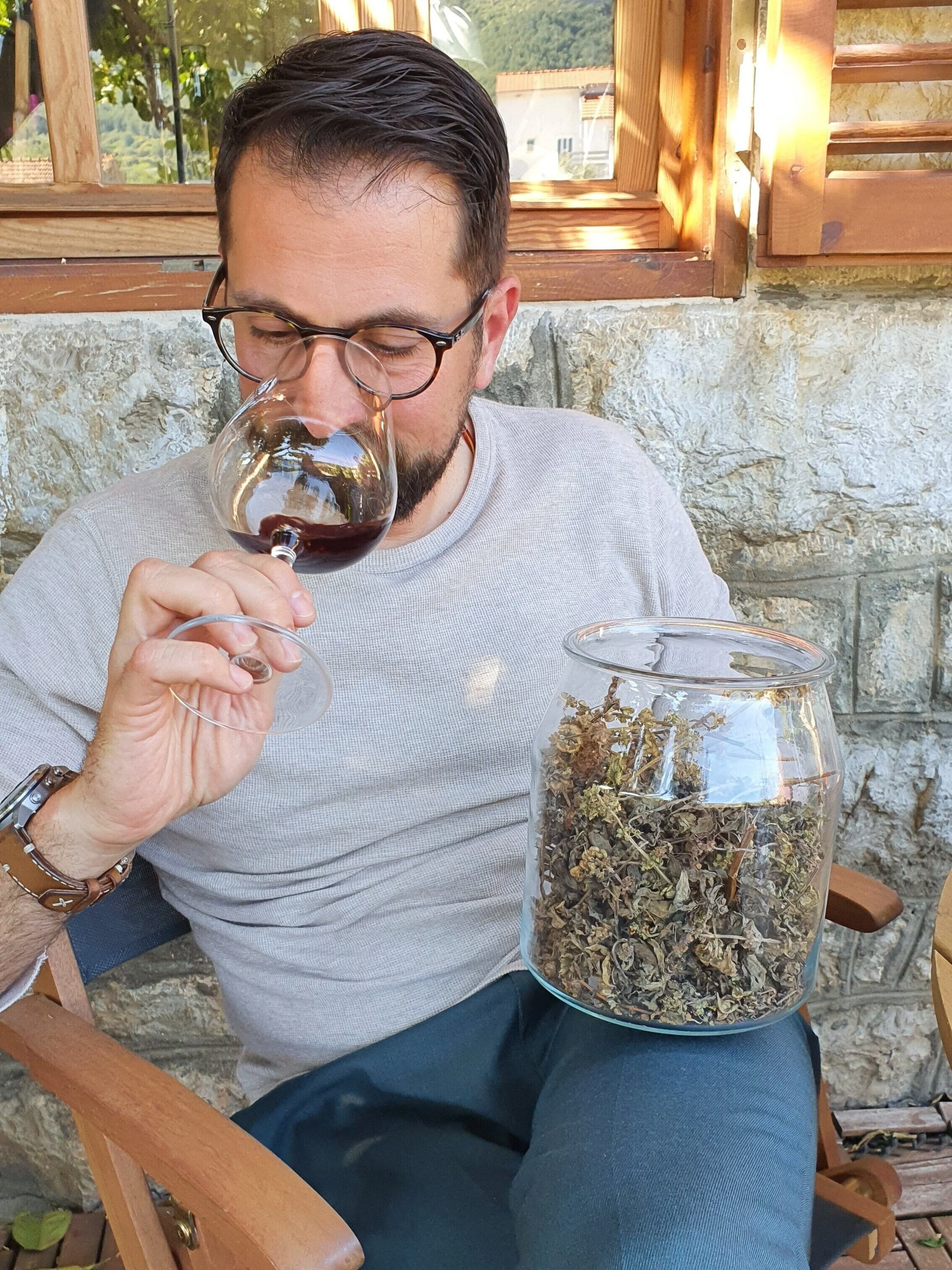 Zoran smelling dried oregano to find the notes in Medvid.